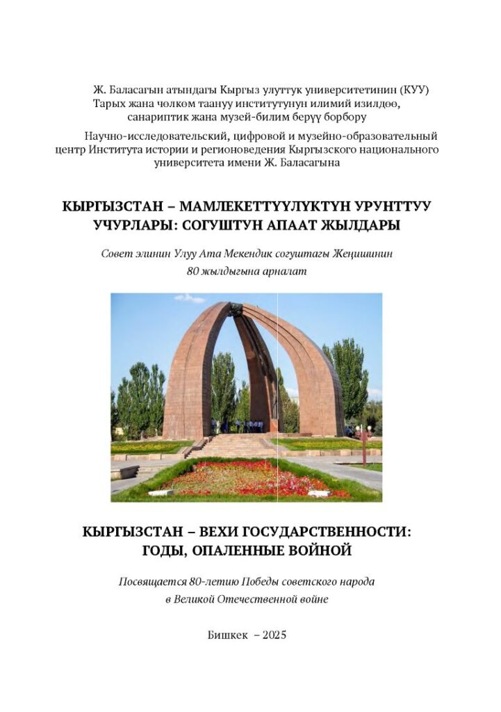- Кыргызстан – мамлекеттүүлүктүн урунттуу учурлары: согуштун апаат жылдары (Улуу Ата Мекендик согуштагы совет элинин Жеңишинин 80 жылдыгына арналат) = Кыргызстан – вехи государственности: годы, опаленные войной (посвящается 80-летию Победы советского народа в Великой Отечественной войне). – Бишкек: Maxprint, 2025. – 624 б.