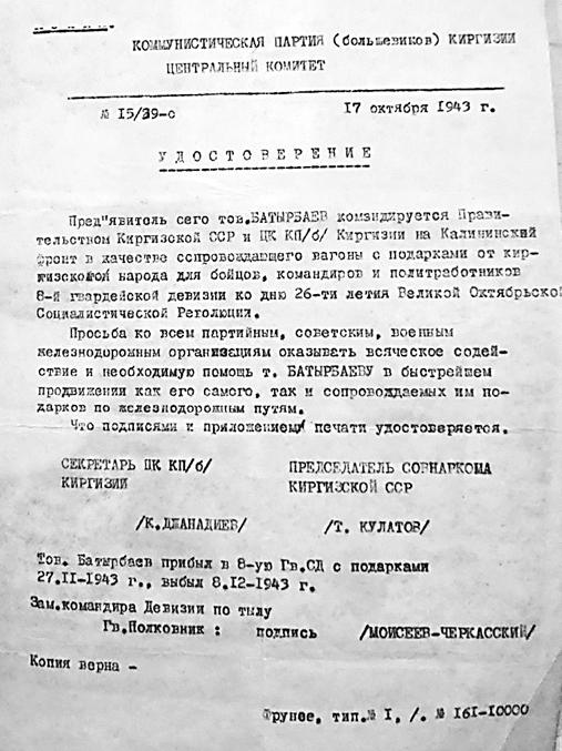 - Ошский областной государственный архив политической документации. – Ф. 2. – Оп. 4. – Ед. хр. 213. – Л. 9–10.