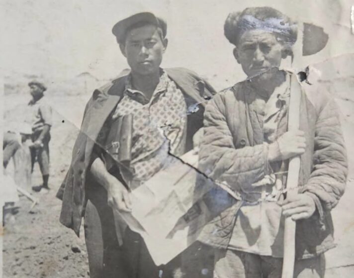 Батырбаев С., заведующий отделом райкома партии Фрунзенской области, с одним из участников строительства Большого Чуйского канала. 1940 год.