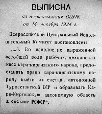 Постановлением Всероссийского центрального исполнительного комитета (ВЦИК) РСФСР 14.10.1924 г. Была образована Кара-Киргизская автономная область. Это событие стало началом формирования современной кыргызской государственности и объединения кыргызского народа в единую нацию. В 2024 г. Кыргызская Республика отметила 100-летие создания Кара-Киргизской автономной области.